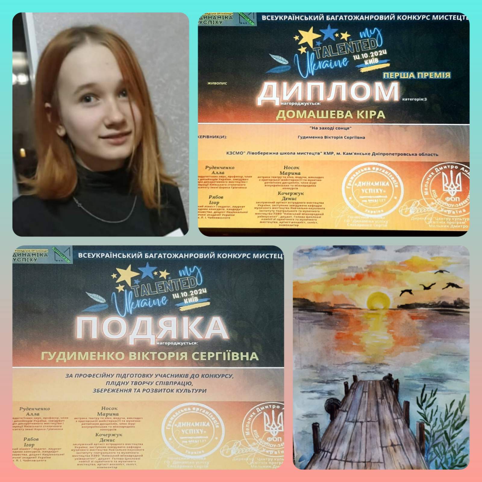 Талантливая художница победила во Всеукраинском многожанровом конкурсе искусств My Talented Ukraine в номинации “Живопись”. За свою работу “На заході сонця” девочка была отмечена дипломом I премии.
