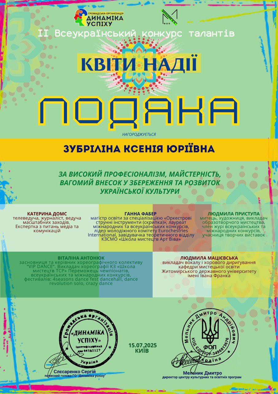 Эта вера в будущее расцвела на II Всеукраинском конкурсе талантов «Квіти надії» (Киев), который проходил 15 июля в дистанционном формате. Его проводила общественная организация «Динаміка успіху».