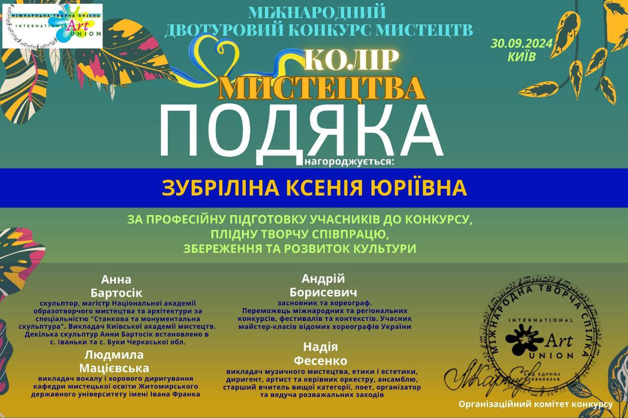 Десятилетняя девочка приняла участие в Международном двутурном конкурсе искусств “Колір мистецтв”, который состоялся в Киеве 30 сентября. Его проводил Международный творческий союз Art Union.