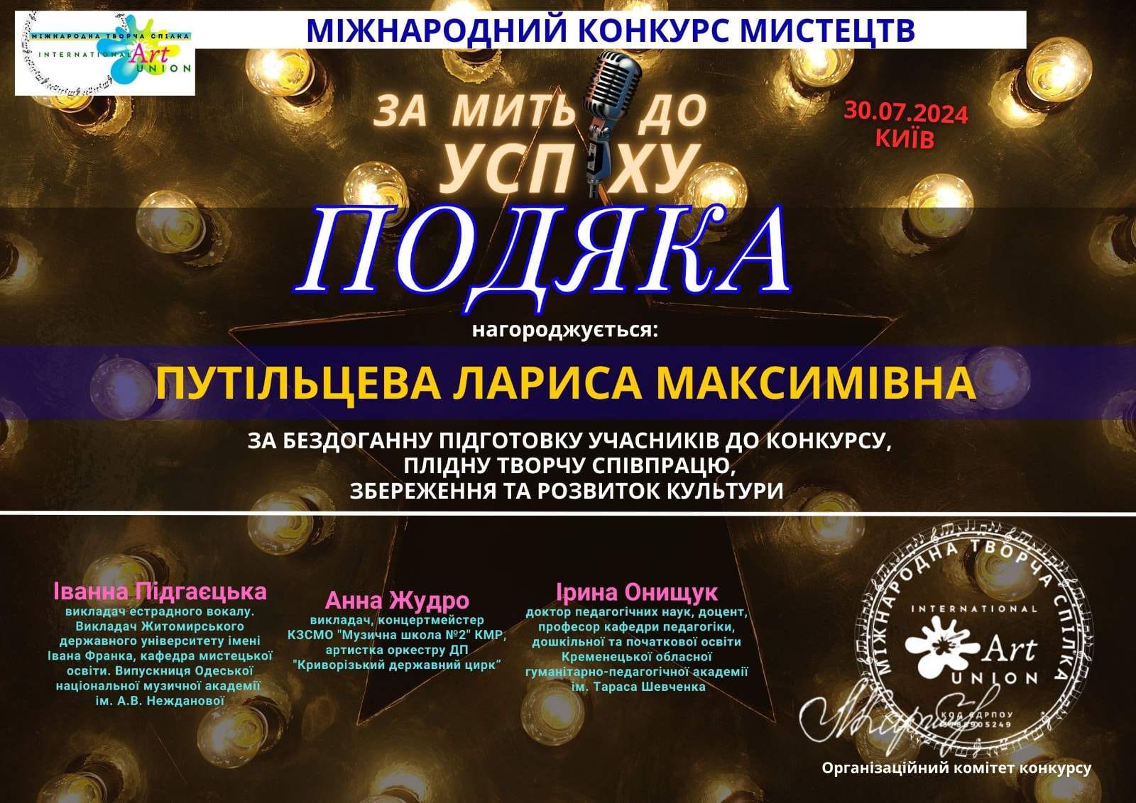 Преподаватель Лариса Путильцева получила благодарность за безупречную подготовку участников к конкурсу, плодотворное творческое сотрудничество, сохранение и развитие культуры.