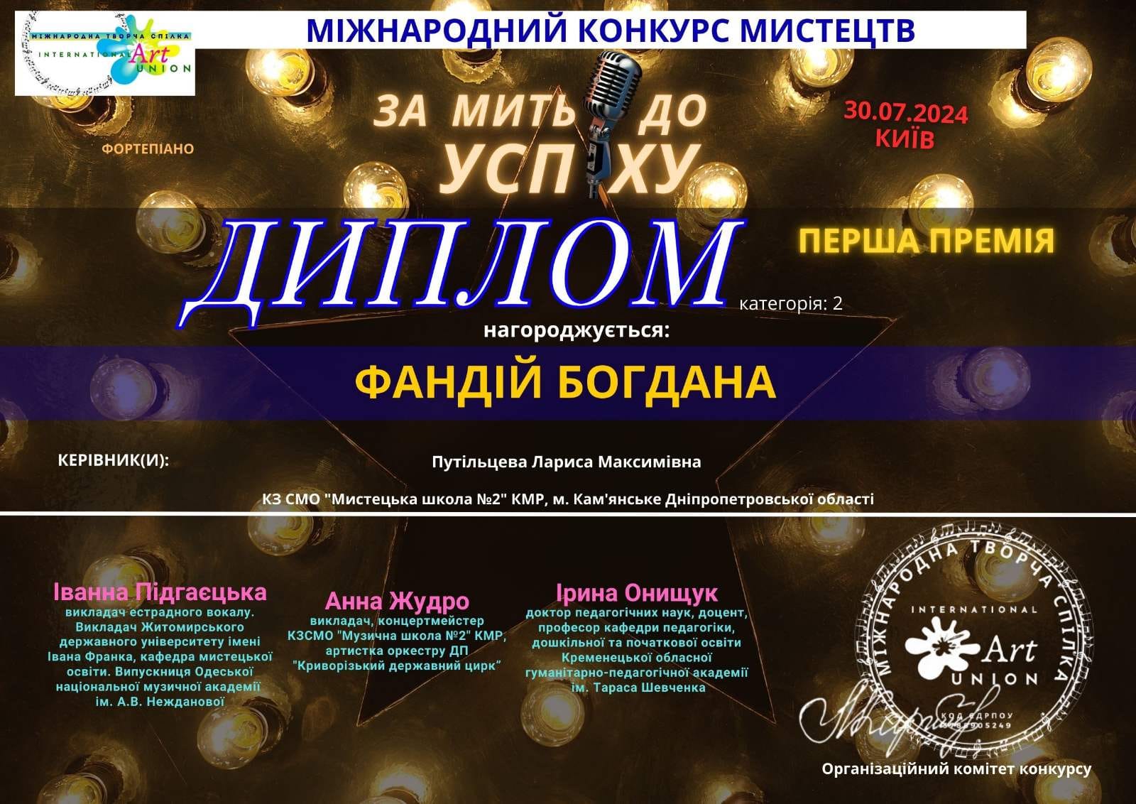 Ученица фортепианного отдела каменской школы искусств №2 Богдана Фандий приняла участие в конкурсе и по решению жюри была отмечена дипломом первой премии.