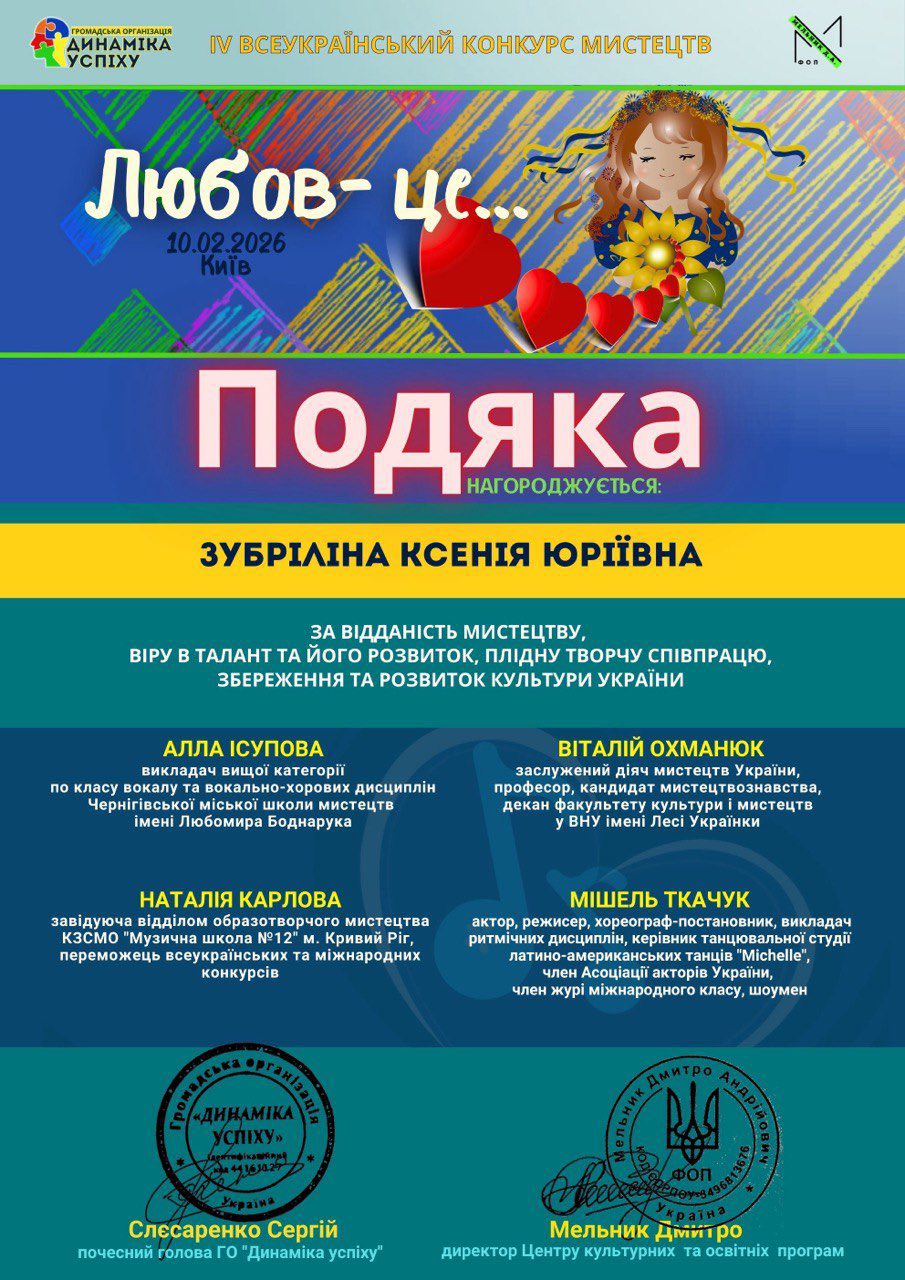 Преподаватель Ксения Зубрилина награждена благодарность за преданность искусству, веру в талант и его развитие, плодотворное творческое сотрудничество, сохранение и развитие культуры Украины.