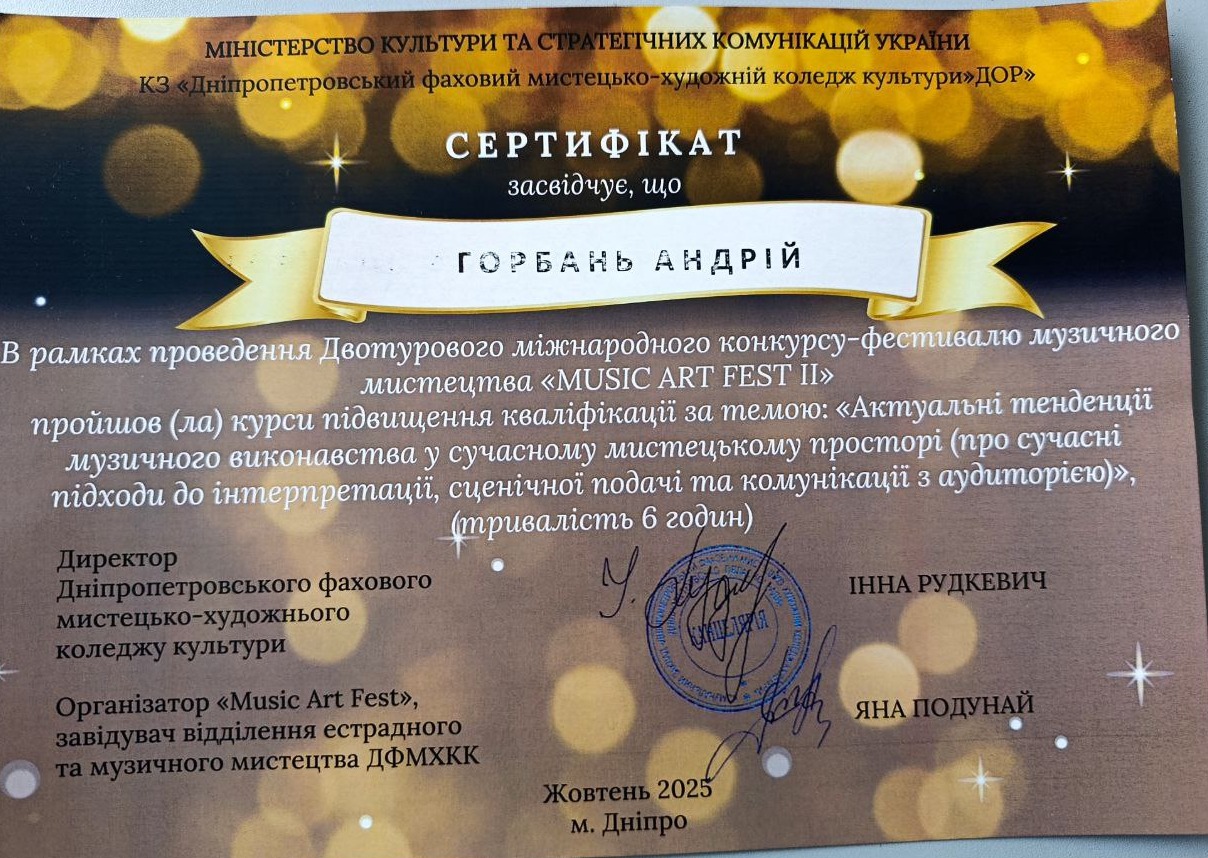В рамках проведения конкурса-фестиваля Андрей Владимирович прошел курсы повышения квалификации на тему “Актуальні тенденції музикального виконавства у сучасному мистецькому просторі (про сучасні підходи до інтерпретації, сучасної подачі та комунікації з аудиторією)” и получил сертификат.
