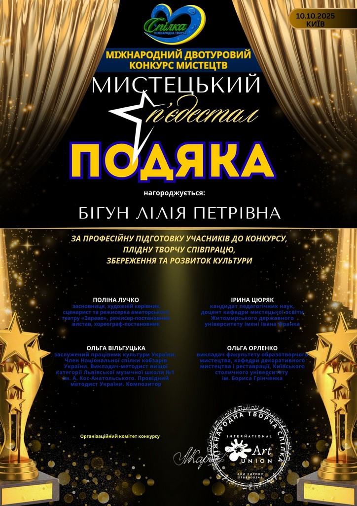 Мир искусства снова заиграл новыми, яркими и глубокими красками. Каждый подобный конкурс это не просто соревнование, а настоящее открытие, которое несет с собой бесчисленное множество неповторимых впечатлений, искренних эмоций и знакомство с удивительными талантами. “Мистецький п’єдестал” стал источником вдохновения, праздником творческого взлета и демонстрацией неиссякаемой энергии, бурлящей в сердцах конкурсантов.