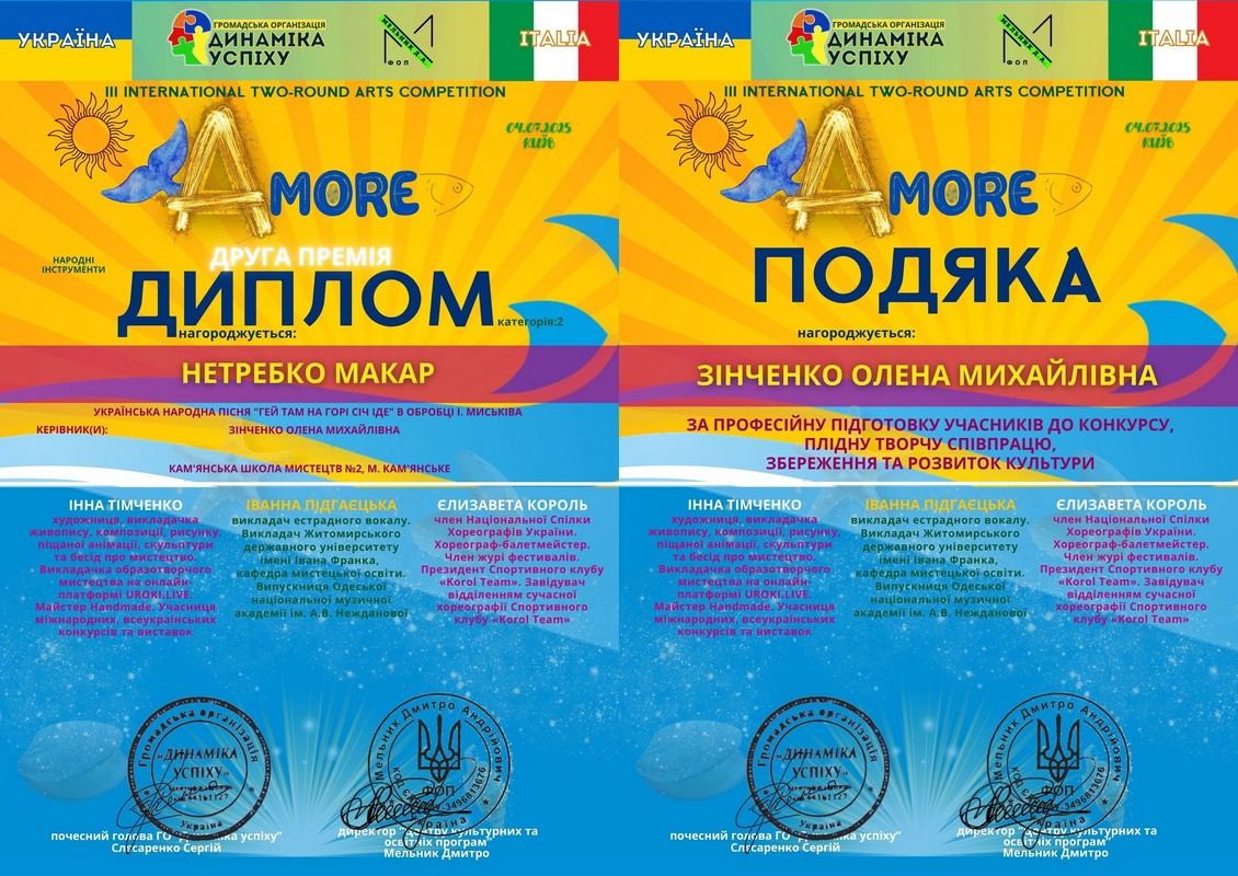 Призовое место на III Международном двухтуровом конкурсе искусств Amore занял Макар Нетребко – ученик третьего класса элементарного подуровня оркестрового отдела Каменской школы искусств № 2. Юному аккордеонисту присудили вторую премию за исполнение украинской народной песни “Гей, там на горі Січ іде” (в обработке Ивана Мыськива).