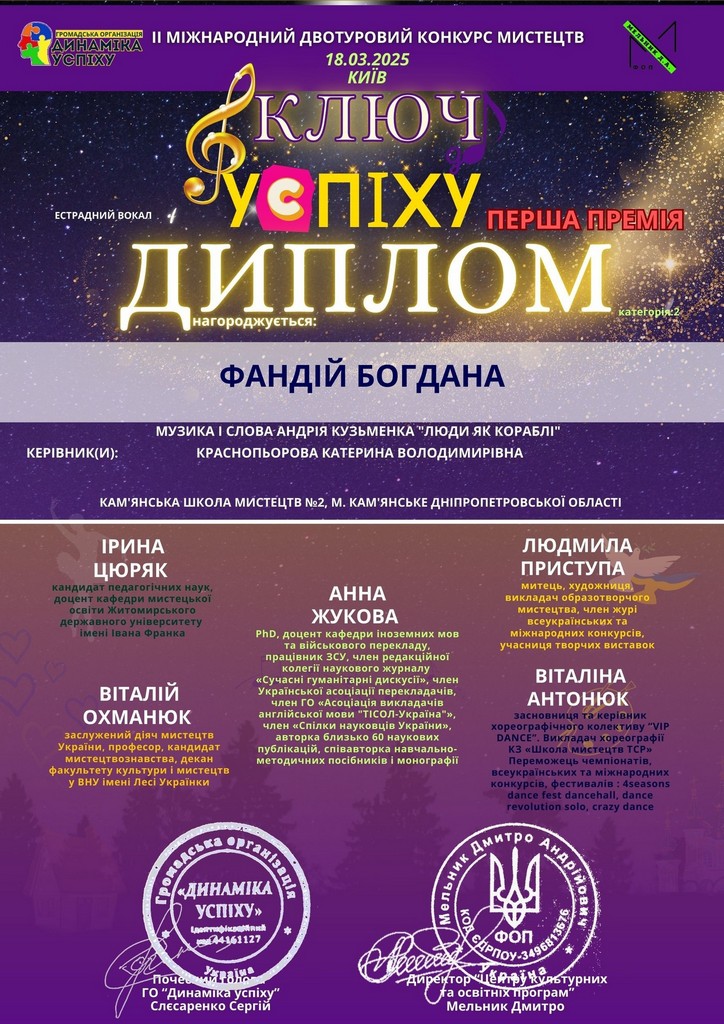 Богдана Фандий – I премия (“Эстрадный вокал”);