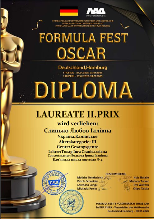 Ученица сольного пения Любовь Слинько заняла второе место на Международном благотворительном конкурсе искусств OSCAR-FORMULA FEST, который прошел дистанционно в Германии. Девочка награждена дипломом лауреата в номинации “Академический вокал”.