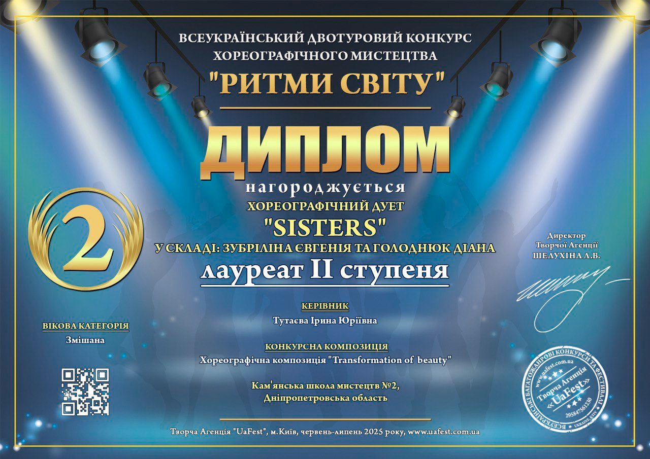 - Хореографический дуэт SISTERS в составе Дианы Голоднюк и Евгении Зубрилиной – диплом лауреата II степени (преподаватель Ирина Тутаева).