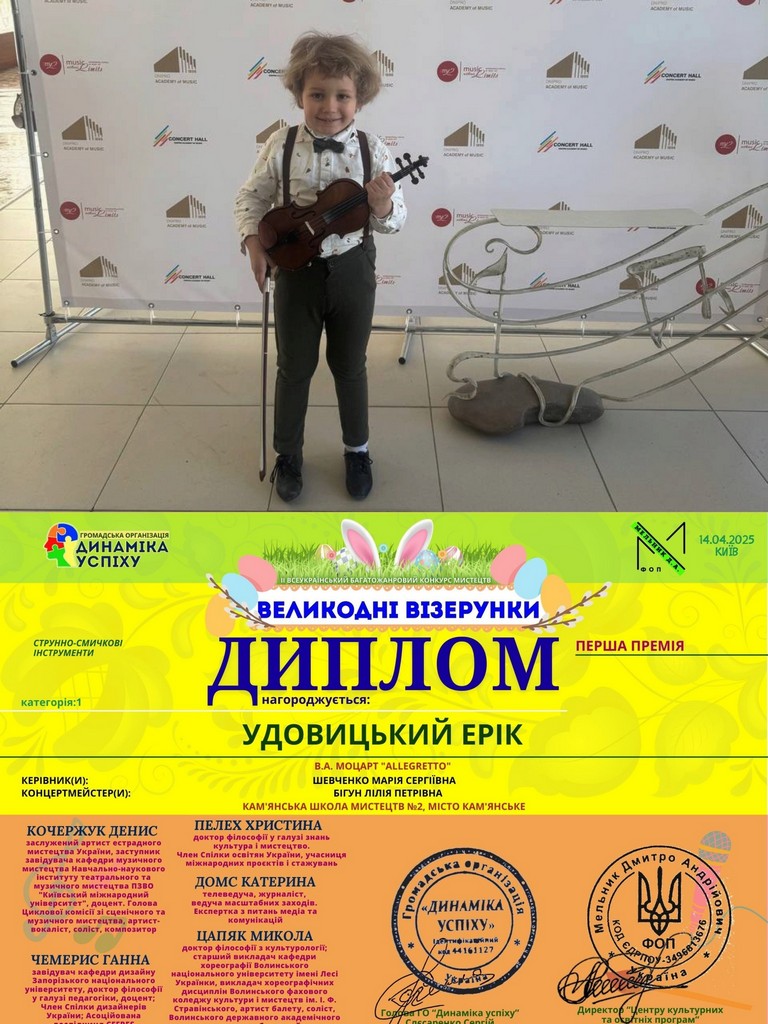 Ученики первого класса, поразив судейскую коллегию игрой на скрипке, показали блестящие результаты. Маленькие звездочки Эрик Удовицкий и Елизавета Швец заняли первое место в номинации “Струнно-смычковые инструменты”.
