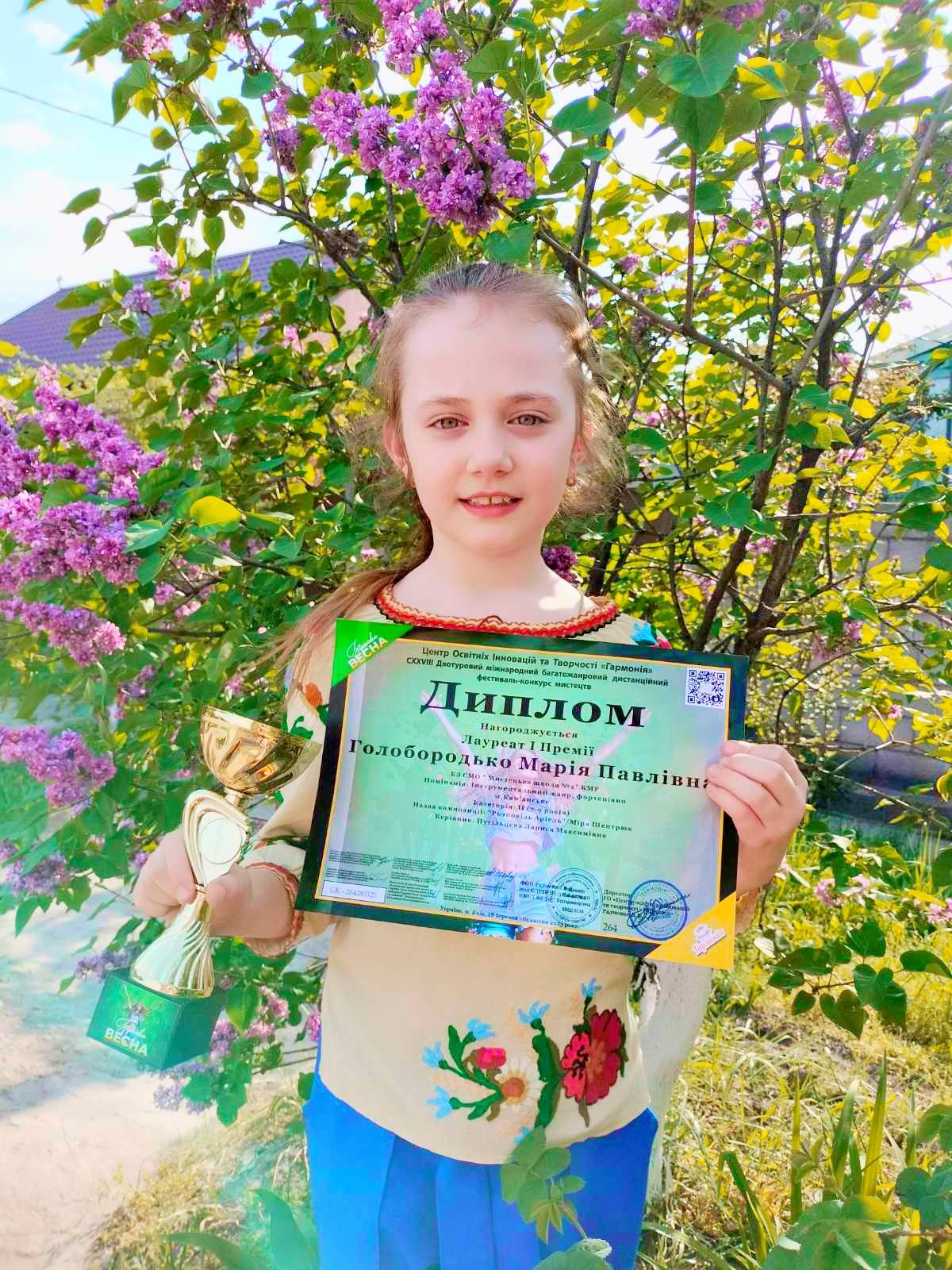 Лауреатом I премии стала ученица фортепианного отдела Мария Голобородько. Юная пианистка достойно представила школу на двухтуровом Международном многожанровом дистанционном фестивале-конкурсе искусств “Зіркова Весна“. Организовал его Центр образовательных инноваций и творчества “Гармонія”. Итоги конкурса были подведены 1 апреля в Киеве. По мнению жюри, Мария безупречно сыграла произведение современной украинской композиторки Миры Шентюрк “Розповідь Арієль”. Девочке были вручены заслуженные награды – кубок и диплом. По традиции организаторы конкурса отметили благодарностью и преподавателя Ларису Максимовну Путильцеву – за безупречную подготовку участницы к конкурсу, плодотворное творческое сотрудничество, сохранение и развитие культуры Украины.
