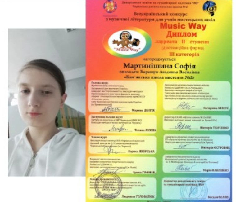 Диплом лауреата II степени получила ученица III класса базового подуровня София Мартинишина (преподаватель Людмила Васильевна Баращук). Девочка успешно выступила на Всеукраинском конкурсе по музыкальной литературе Music Way, который состоялся в Черкассах. Позади остались волнения, часы кропотливого и упорного труда над подготовкой к конкурсу, тщательное оформление записи выступления. Все эти усилия не прошли даром, ведь завоеванное почетное второе место и есть настоящая победа.