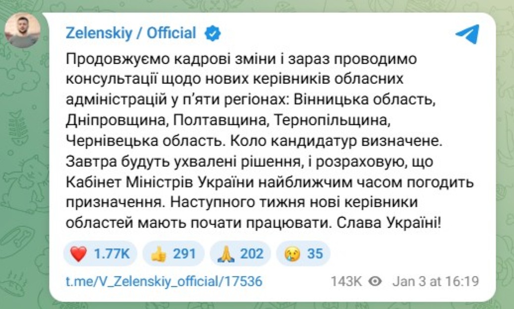 Об этом говорится в сообщении, опубликованном 3 января на телеграм-канале президента Владимира Зеленского.