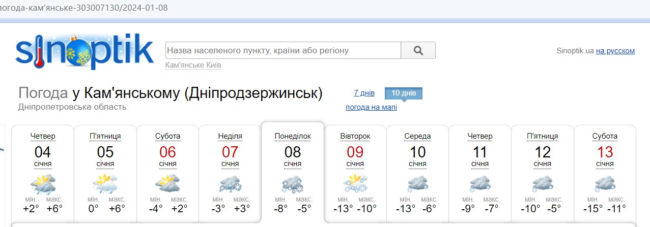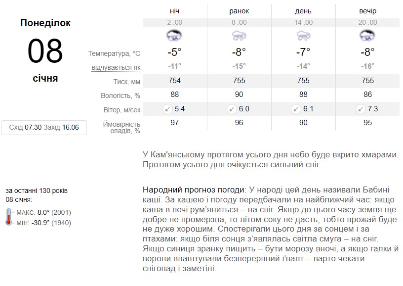 По данным sinoptik.ua, в Каменском ухудшение погодных условий ожидается с 7–8 января (сильный снег, понижение температуры воздуха до 130С мороза).