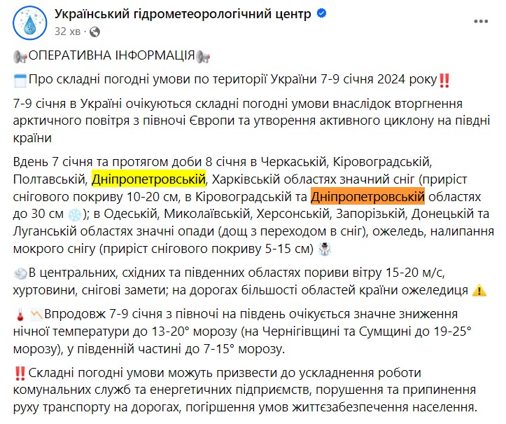 7–9 января в Украине ожидаются сложные погодные условия в результате вторжения арктического воздуха с севера Европы и образования активного циклона на юге страны.