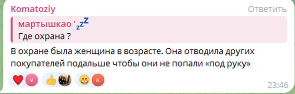 Предваряя возможные вопросы читателей относительно того, где была охрана супермаркета, во время подготовки публикации редакция обратила внимание на такой комментарий. В какой-то степени он объясняет действия персонала магазина в данной ситуации: