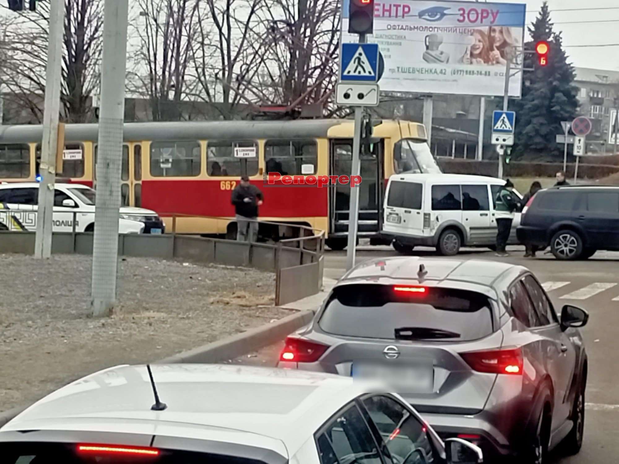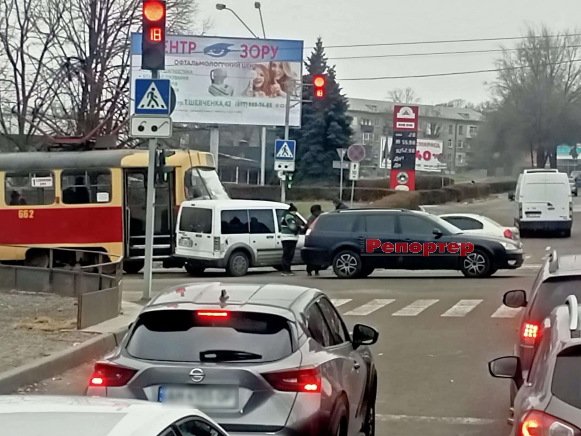 На пересечении проспектов Тараса Шевченко и Возрождения (Аношкина) произошло столкновение трамвая №1 и легкового автомобиля Ford Transit. В результате аварии был поврежден еще один автомобиль, который ехал рядом, — Ford Mondeo.