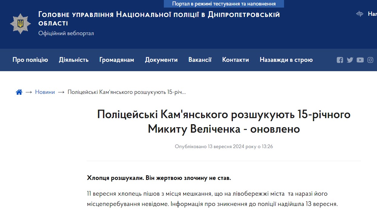 Если у вас есть информация о местонахождении Никиты Величенко, 2009 г. р., или у вас есть информация, которая сможет помочь в поиске подростка, обратитесь в полицию по телефонам: 068-799-39-81, 073-206-88-16, 096-586-94-41 или 102.