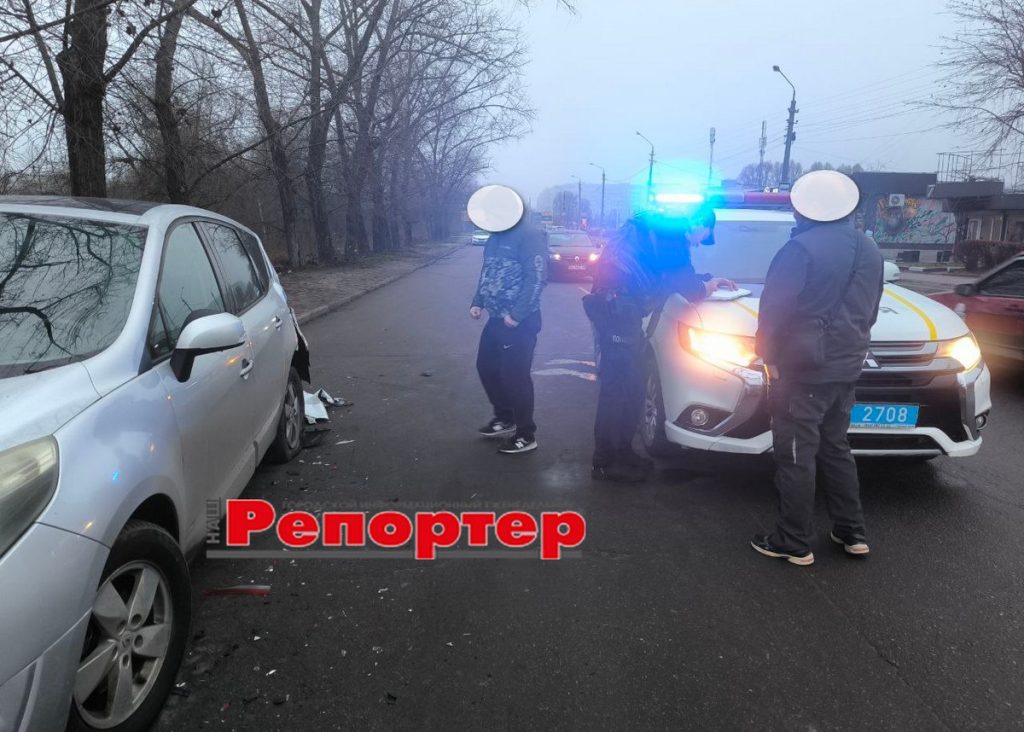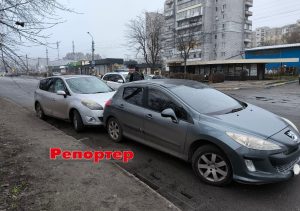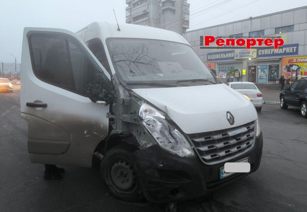 Инцидент имел место на Левобережье вечером субботы, 29 ноября. Участники аварии – бус («Рено») и две легковушки («Рено» и «Пежо»). Они стоят на месте ДТП в попутном направлении.