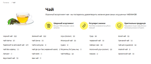 2. Чай – чорний, зелений, білий, трав’яний та фруктовий чай на будь-який смак. Ексклюзивні купажі для справжніх гурманів.
