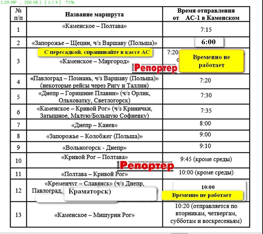 «Кременчуг – Славянск» отправлением с АС-1 Каменского в 10:00;