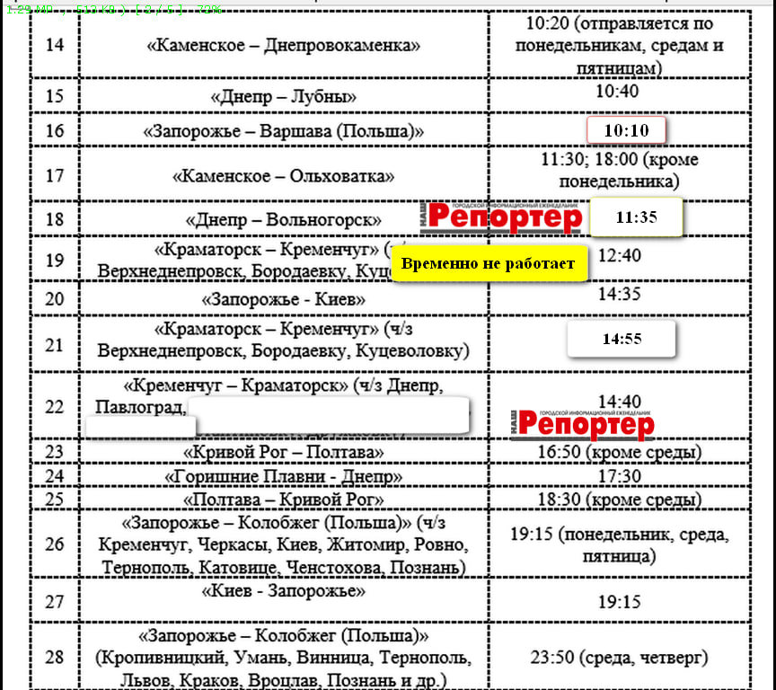 «Кременчуг – Краматорск» отправлением с АС-1 Каменского в 14:40;