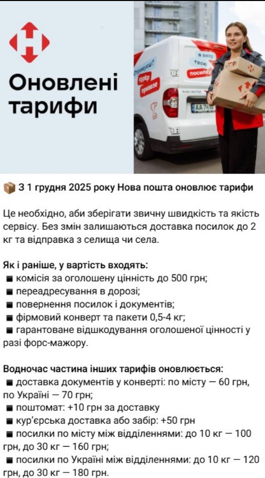 С 1 декабря “Новая почта” изменит часть тарифов на свои услуги.