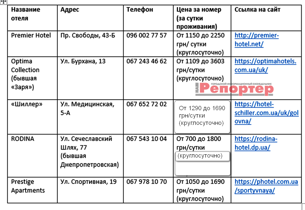 Как видим, цены на гостиничные номера в Каменском имеют значительный разбег: от 600 грн (бюджетные варианты) до 3 600 грн в сутки (гостиницы повышенного комфорта). Большинство заведений работают круглосуточно.