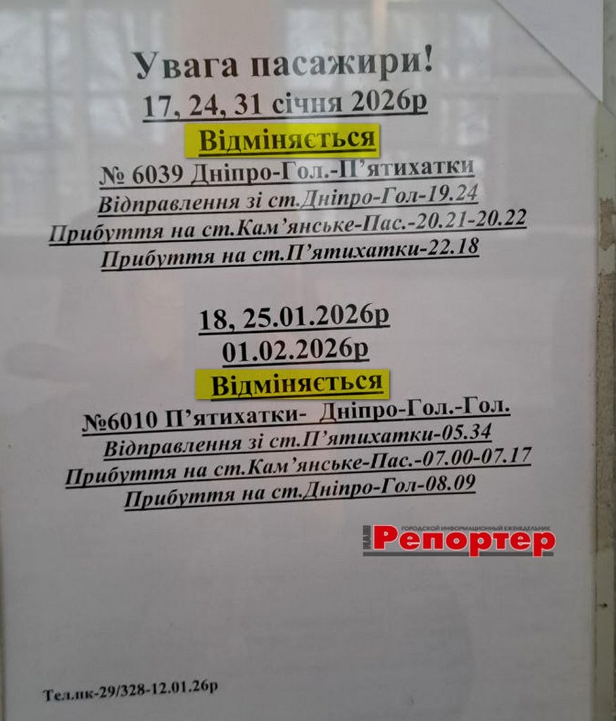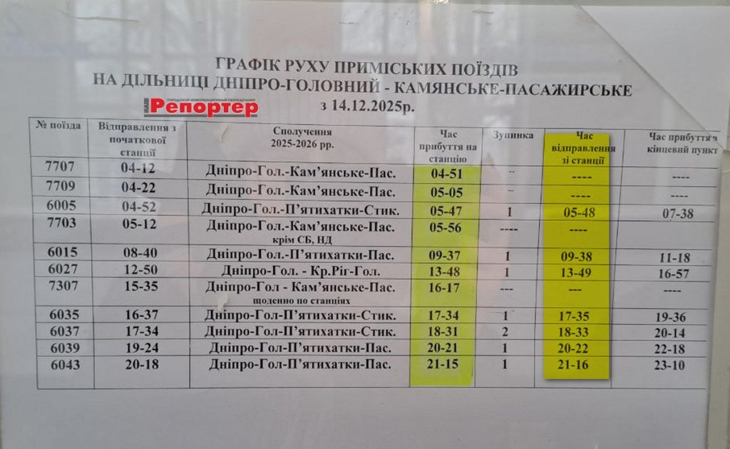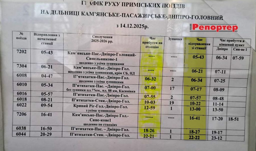 Пассажирам Каменского: изменения в расписании электричек (информация на 15.01.2026)
