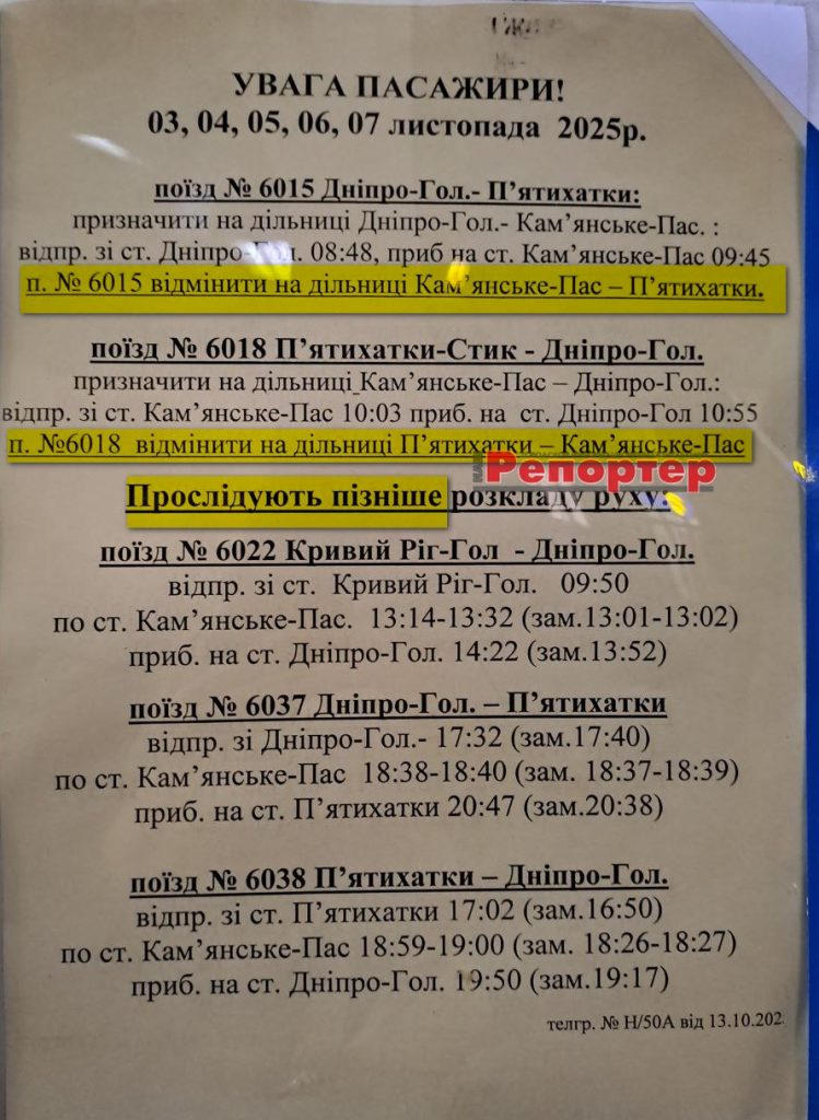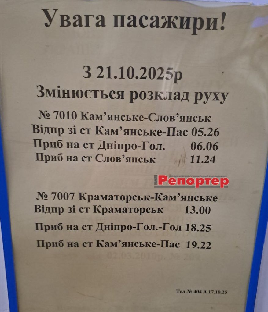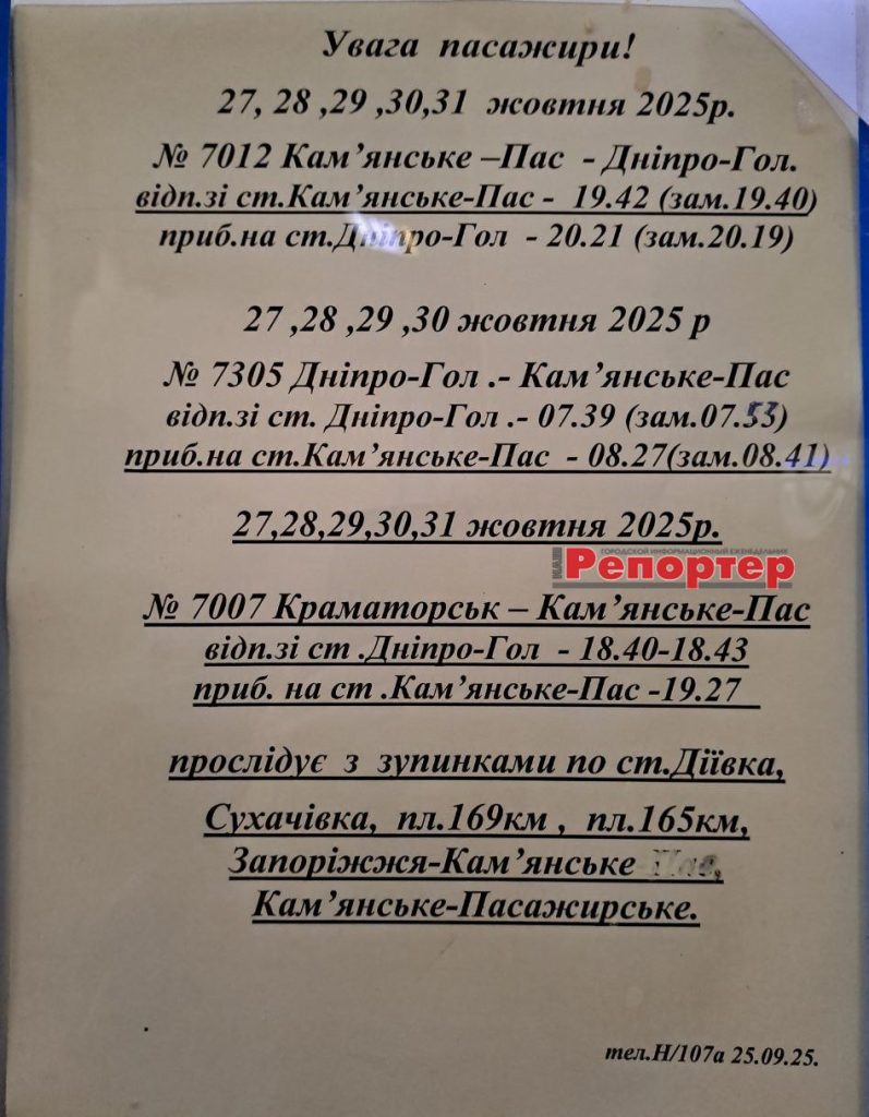 Публикуем официальную информацию (по состоянию на 22 октября 2025 г.), размещенную на железнодорожном вокзале Каменского. Напоминаем телефон справочной: 093-104-70-41.