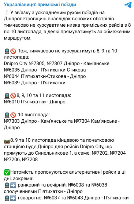 В связи с затруднением движения поездов на Днепропетровщине вследствие вражеских обстрелов временно не будут курсировать ряд пригородных рейсов с 8 по 10 ноября, а некоторые будут следовать по ограниченному маршруту.