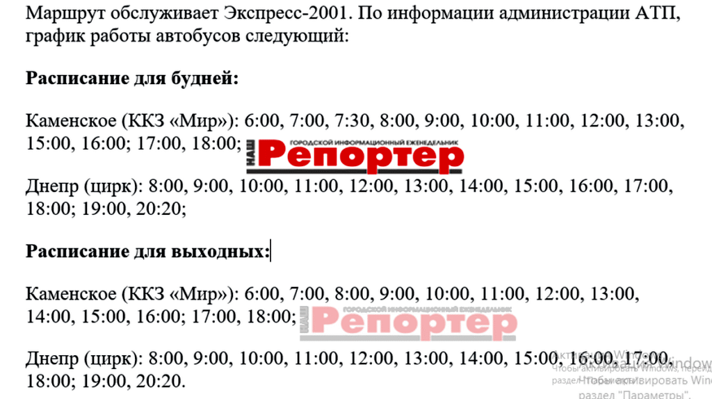 Редакция располагает официальной информацией перевозчика «Экспресс-2001», который обслуживает маршруты «Каменское (ККЗ «Мир», левый берег) – Днепр (цирк)».