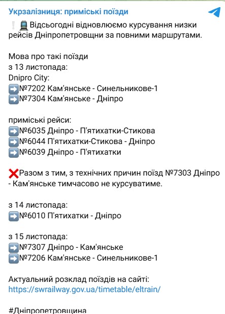 Вместе с тем по техническим причинам поезд № 7303 Днепр – Каменское временно курсировать не будет.