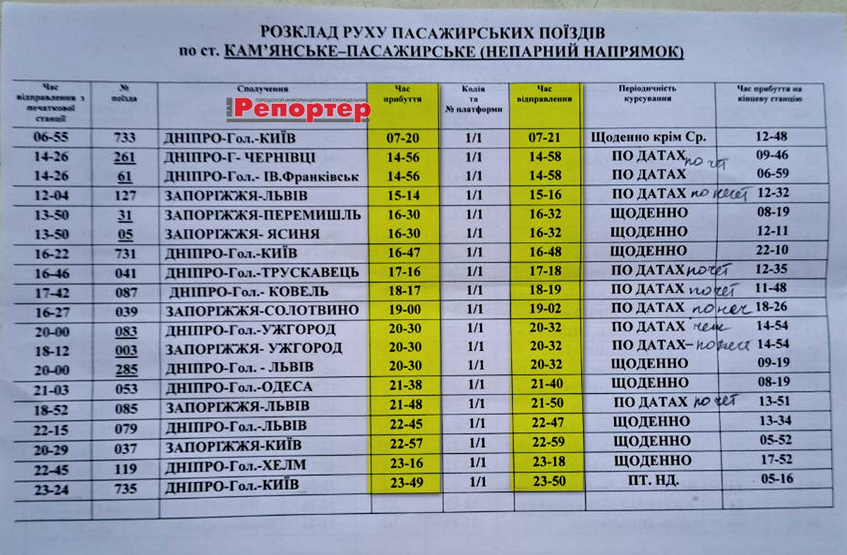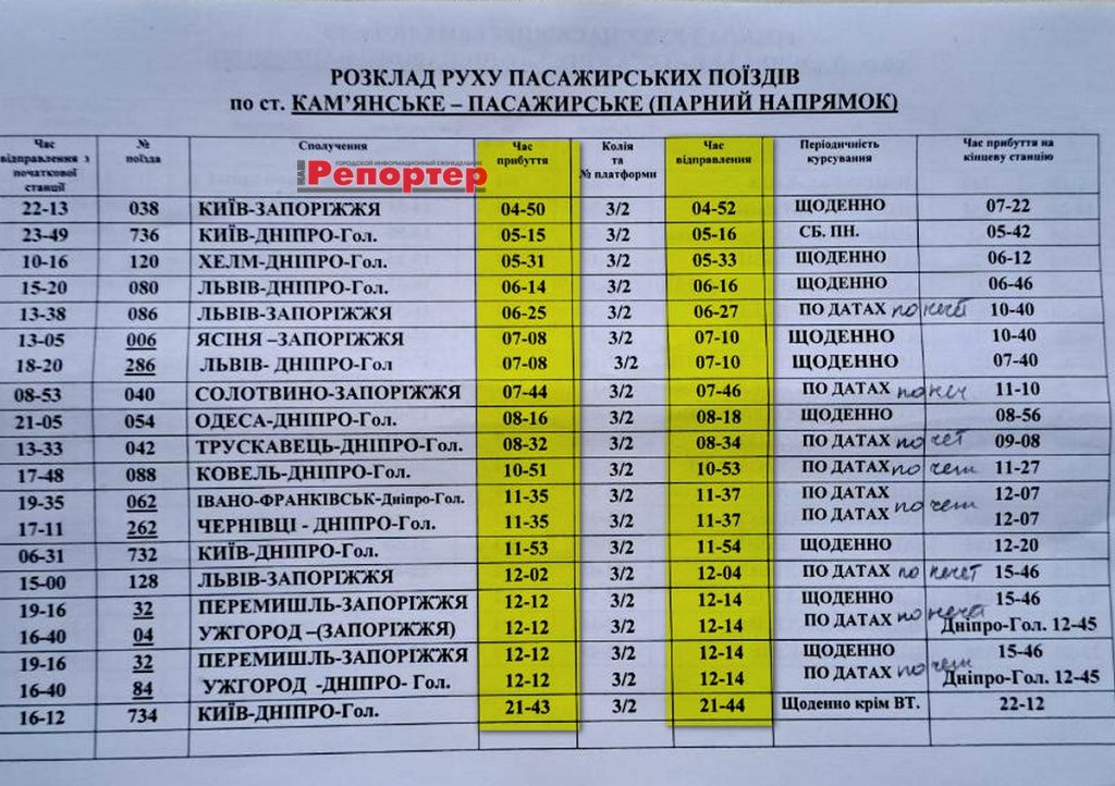 Цветом выделено время отправления со станции Каменское-Пассажирское.
