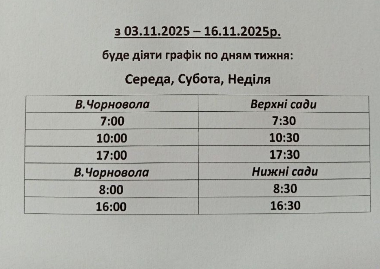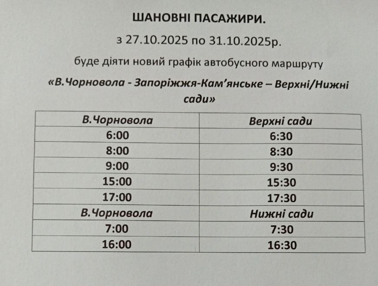 С 27 октября вводится новый график движения автобусов на маршруте “В. Черновола – Запорожье-Каменское (Баглей) – Верхние Сады / Нижние Сады”