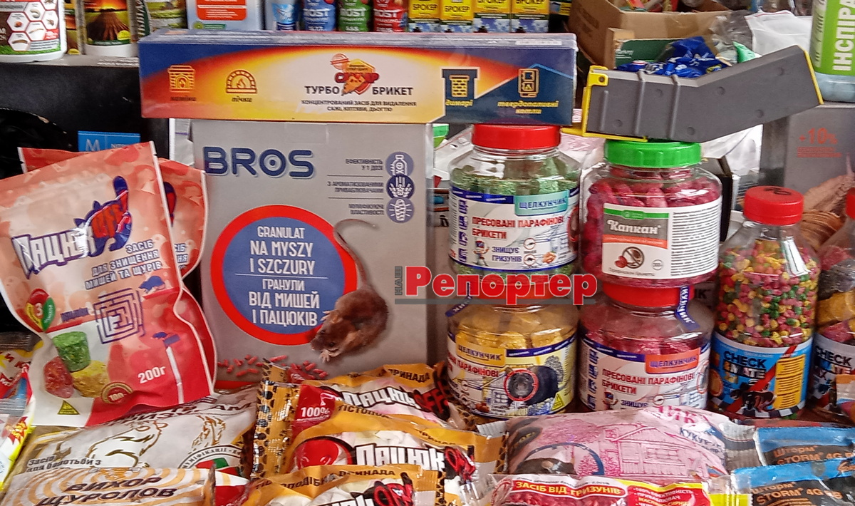 Продавцы показали мне целый ряд упаковок с ядовитыми приманками, которые следует раскладывать в местах, облюбованных крысами и мышами. Большая часть товара произведена в Украине. Стоимость – от 30 до 120 грн за упаковку. Есть и польский препарат. Он дороже – 200 грн за упаковку в 500 г. Но можно найти и упаковки по 50 г.