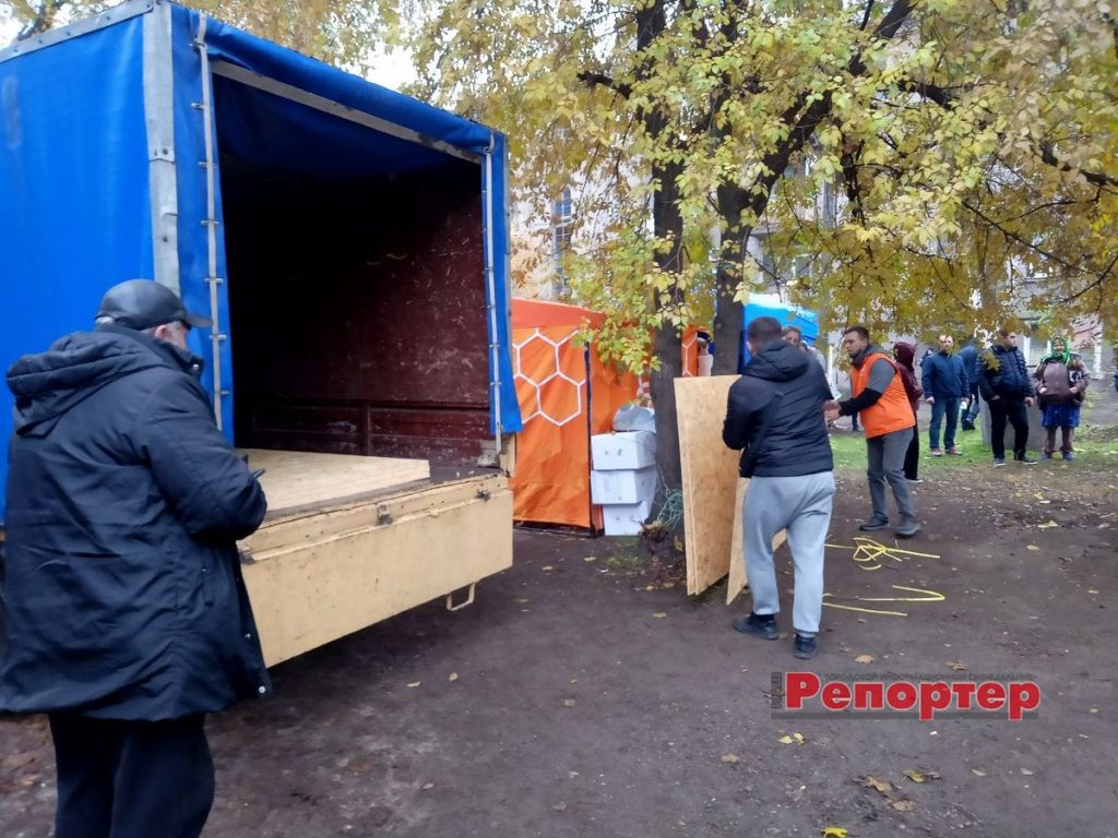 Подвозят деревянные щиты и пленку, чтобы заслонить выбитые окна. Одновременно продолжаются работы по разбору завалов.