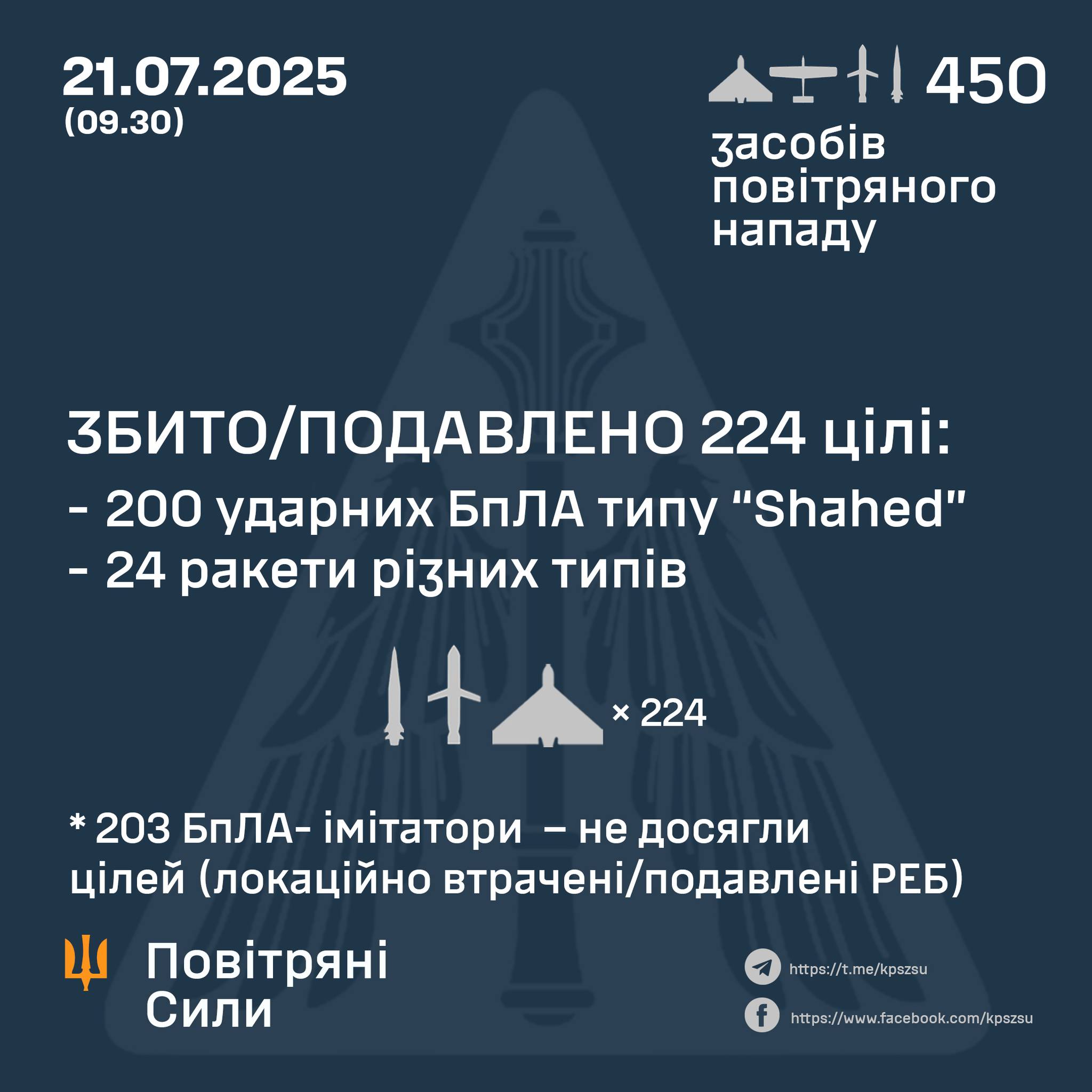 По предварительным данным, по состоянию на 09:30 противовоздушная оборона сбила / подавила 224 средства воздушного нападения противника: