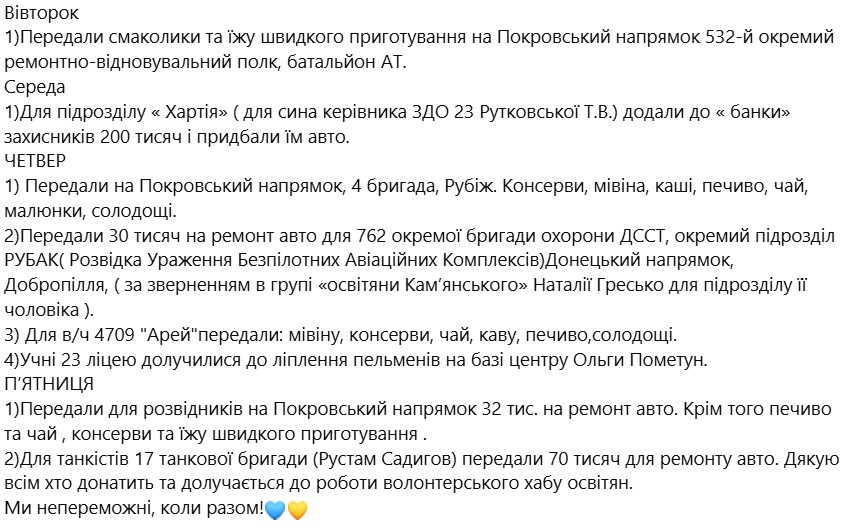 Опубліковано також щотижневий звіт роботи волонтерського хабу освітян у Кам’янському.