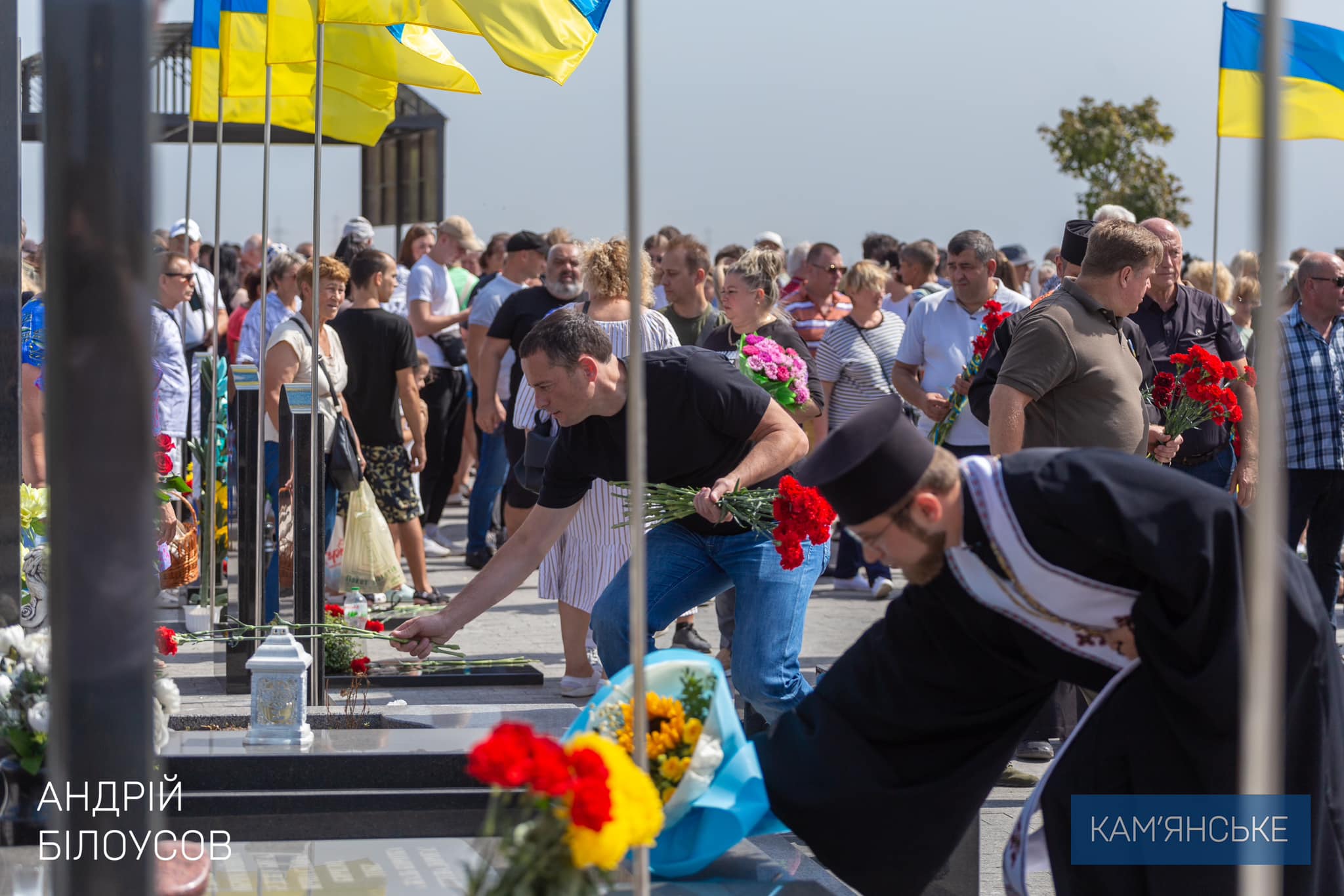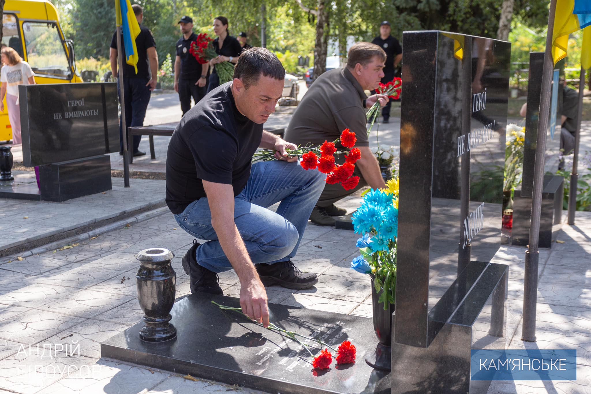Мэр Андрей Белоусов вместе с семьями Героев, начальником Каменской РВА Олегом Гапичем, депутатами городского совета, руководством правоохранительных органов, военными, молодежью и общественностью возложили цветы к мемориалам на майдане Героев и Аллее Славы.