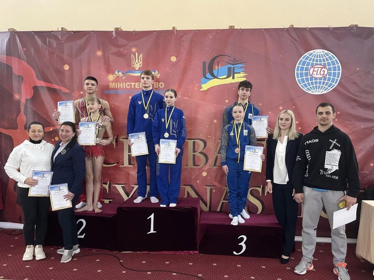 - змішана пара Олександр Савенко, Поліна Погребняк — друге місце у багатоборстві, третє місце у фінальній балансовій та фінальній динамічній вправі за програмою вікової категорії 13-19 років.