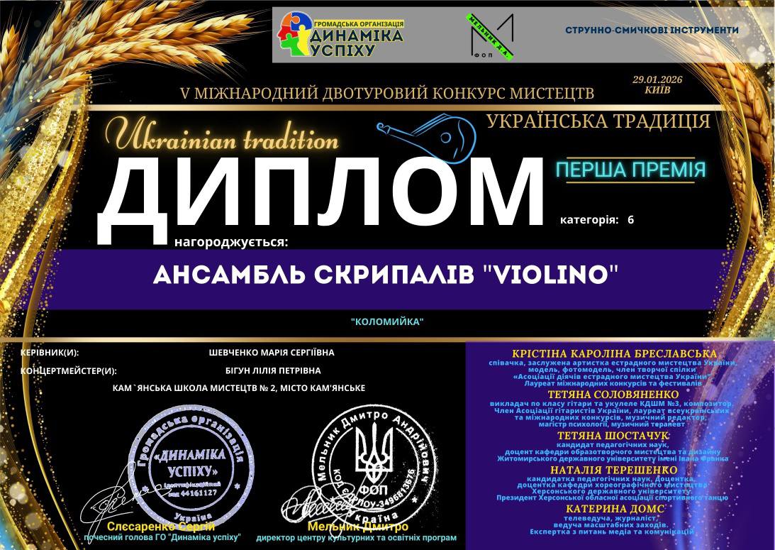 Надзвичайно приємно, що в цьому розмаїтті жанрів та високої конкуренції яскраво заявили про себе учні Кам’янської школи мистецтв № 2 – ансамбль скрипалів Violino. Виконавська майстерність та щира емоційність підкорили серця журі. Ансамбль нагороджено дипломом (перша премія).