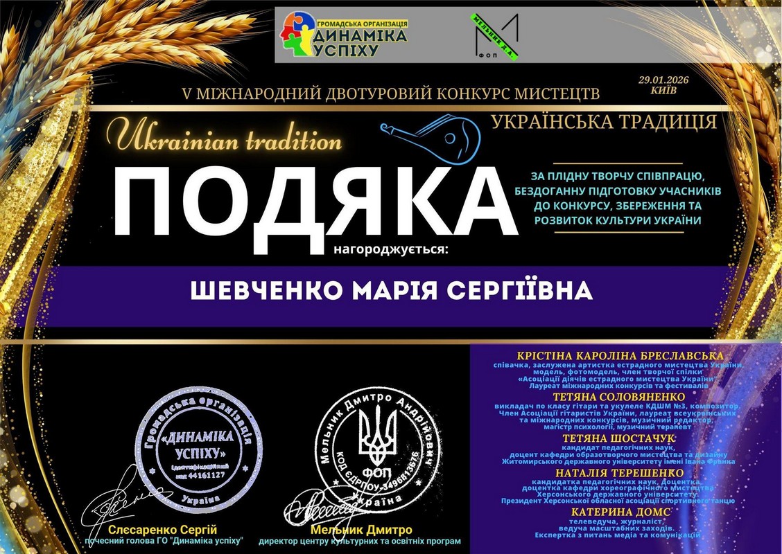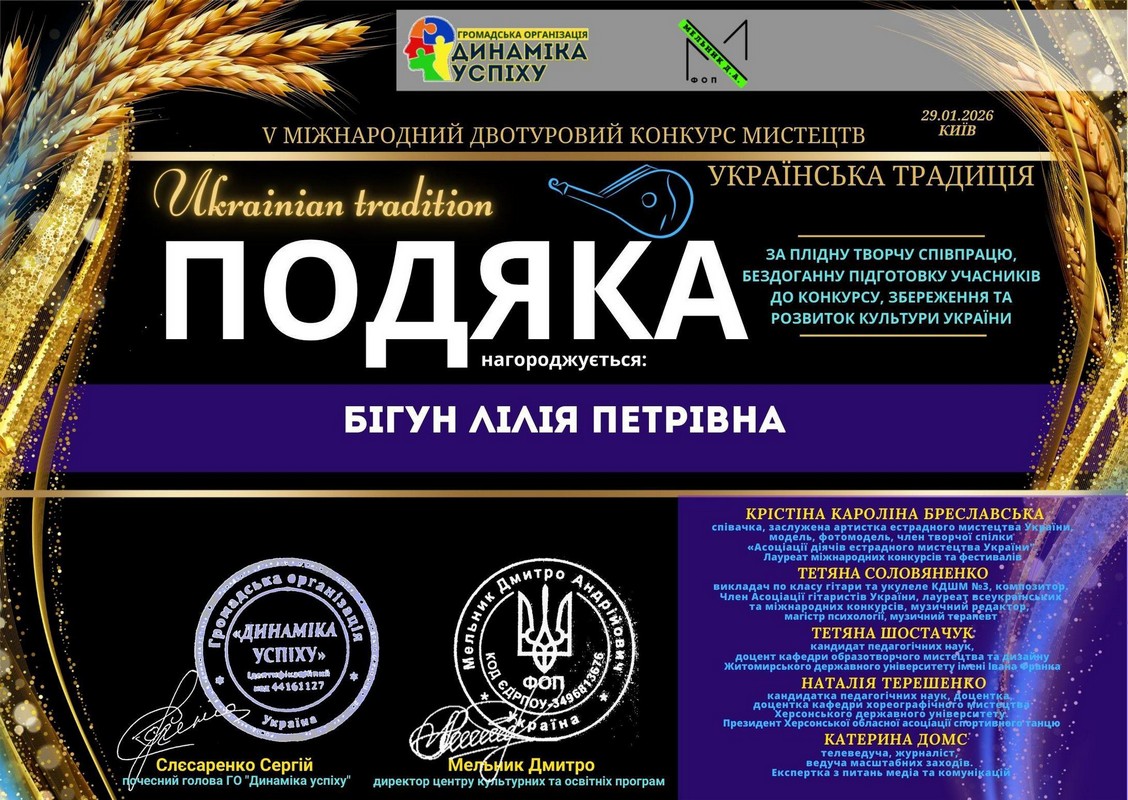 Саме таку ідею – поєднання національного коріння з актуальним творчим баченням – втілив у собі V Міжнародний двотуровий конкурс мистецтв UKRAINIAN TRADITION, що відбувся 29 січня у Києві. Організатором виступила ГО “Динаміка успіху”.