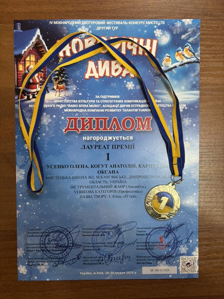 Виконавську майстерність кам’янчан позитивно оцінили на IV Міжнародному двотуровому фестивалі-конкурсі мистецтв “Новорічні дива” (Київ). Він проводився у дистанційному форматі з 28 по 30 грудня за підтримки Міністерства культури та стратегічних комунікацій, Міжнародного радіо “Radio sfera music”, Асоціації діячів естрадного мистецтва України, Міжнародної компанії розвитку талантів “Tuaron”.
