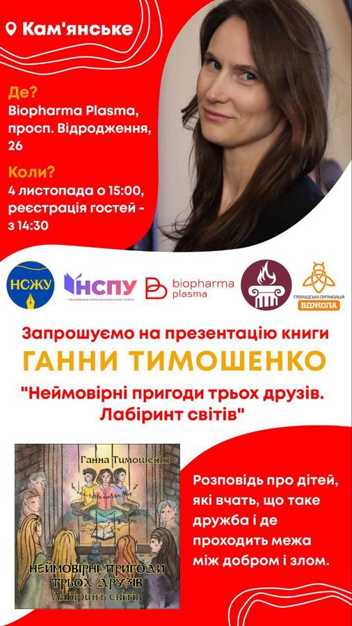 Написала книгу волонтер та журналіст Ганна Тимошенко. Це вже друга її казка про доброту та дружбу. Обидві книжки яскраво оформлені та ілюстровані. Нова історія називається «Неймовірні пригоди трьох друзів. Лабіринт світів».