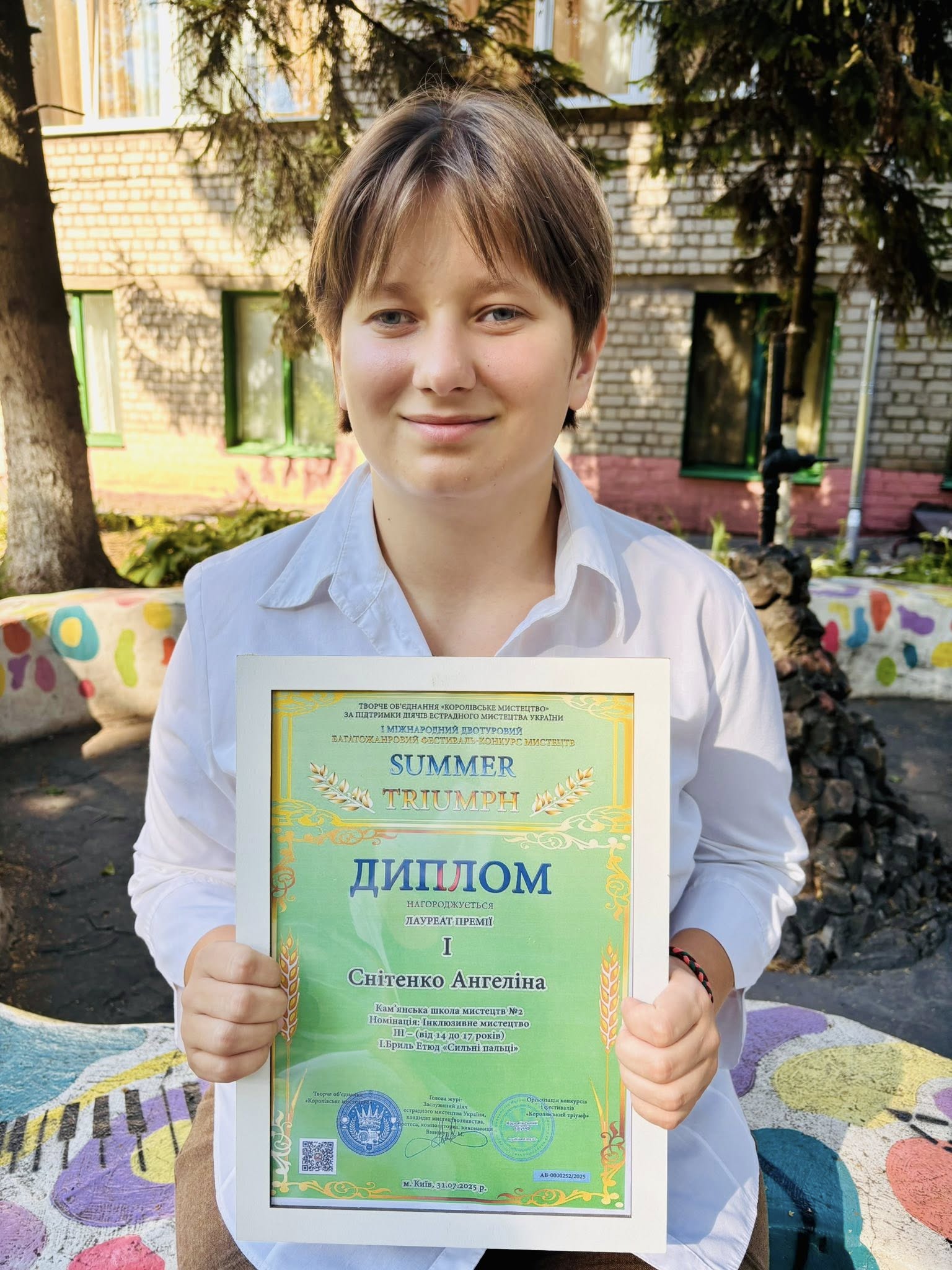 Кам’янська школа мистецтв № 2 пишається успіхами своїх представниць. Учениця фортепіанного відділу Ангеліна Снітенко здобула диплом лауреата І премії (номінація “Інклюзивне мистецтво”). Вона підкорила суддівську колегію виконанням музичного твору І. Бриля – етюд “Сильні пальці”.