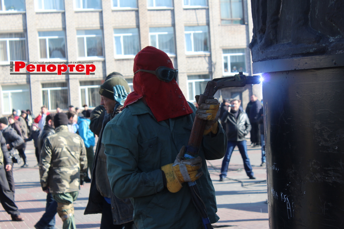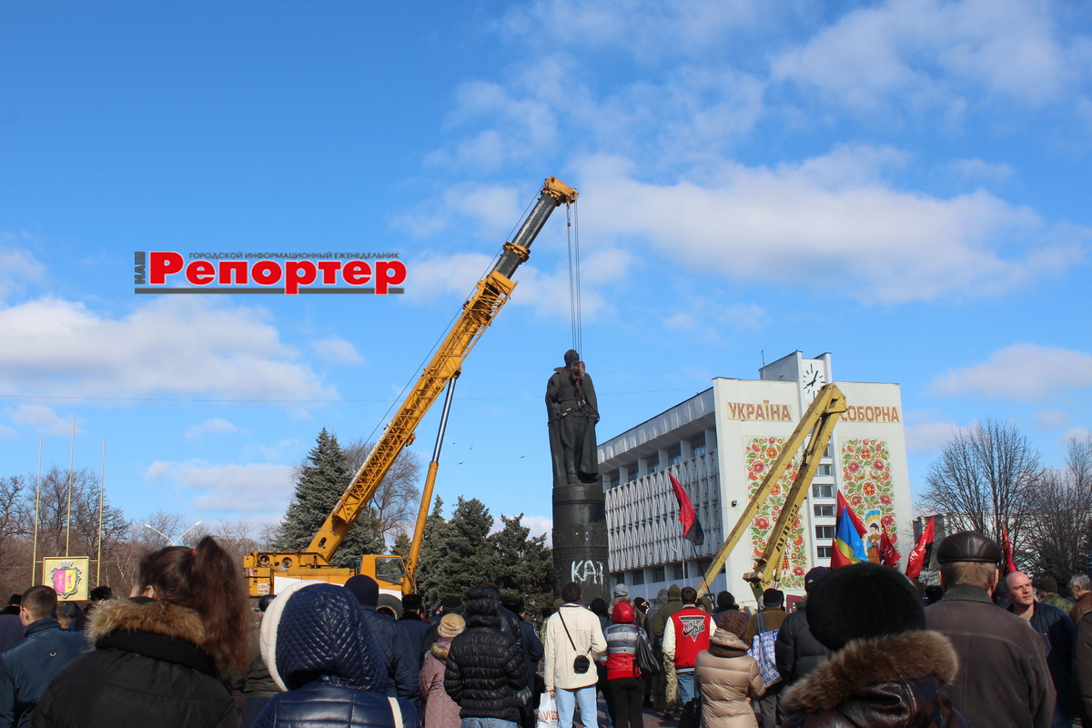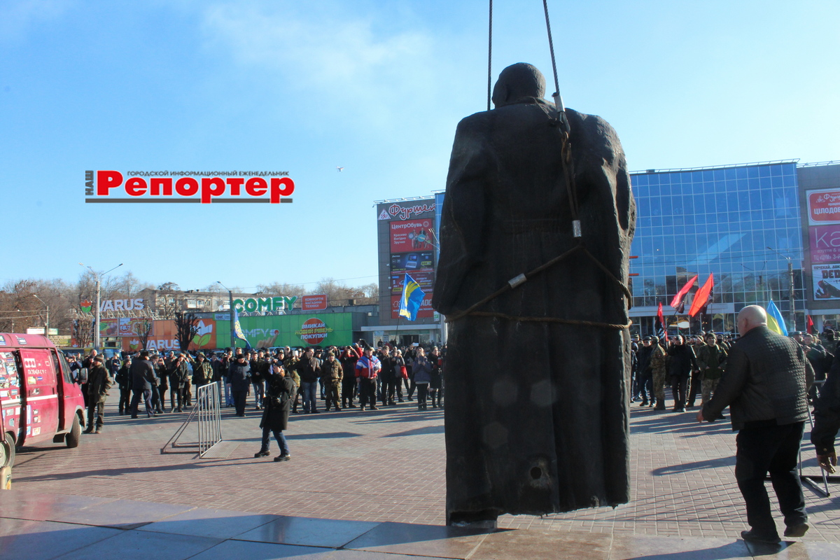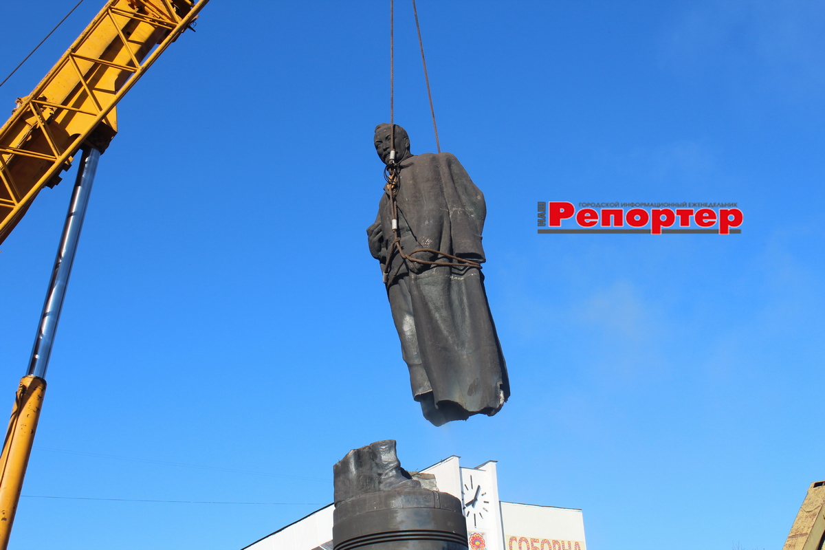 Пам’ятник простояв 49 років і був знесений згідно закону про декомунізацію. Треба сказати, що прибрати його виявилося зовсім не просто. Зроблений був на совість. Постамент та постать становили одне ціле. Фігуру довелося кілька годин відрізати зварюванням, а постамент спецтехніка розбивала ще кілька днів.
