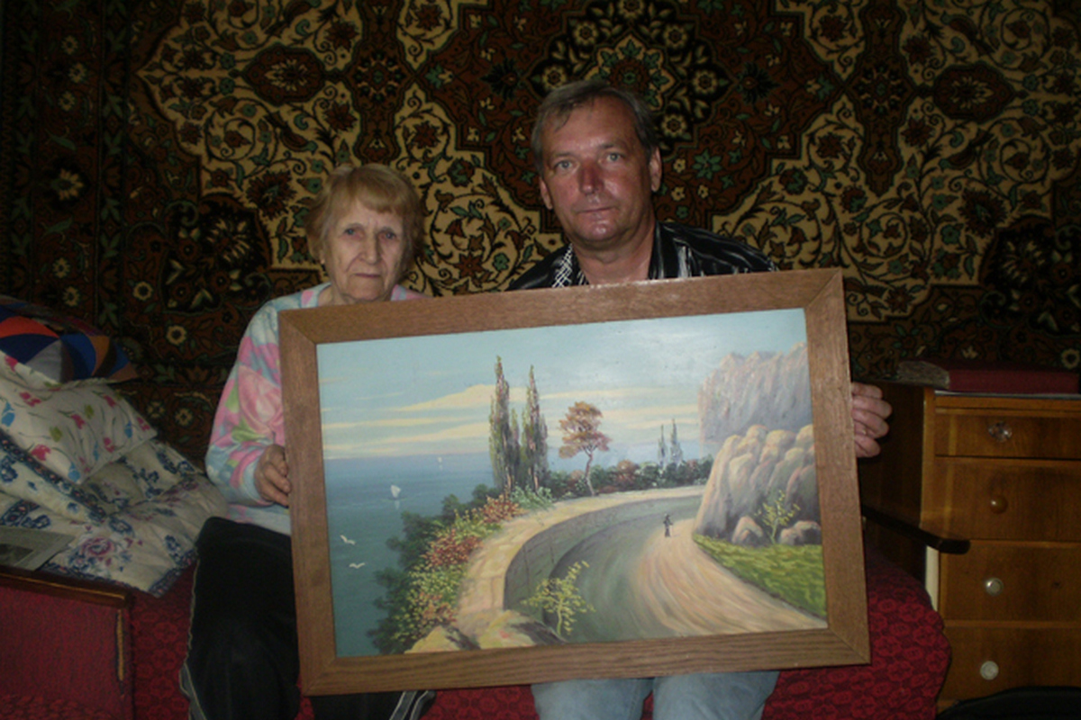 Марія Медвецька та Олександр Слонєвський з картиною Адольфа Медвецького, надісланою з Німеччини. Про те, як це стало можливим, читайте у Олександра Слонєвського. Ця картина була передана до музею історії Кам’янського.