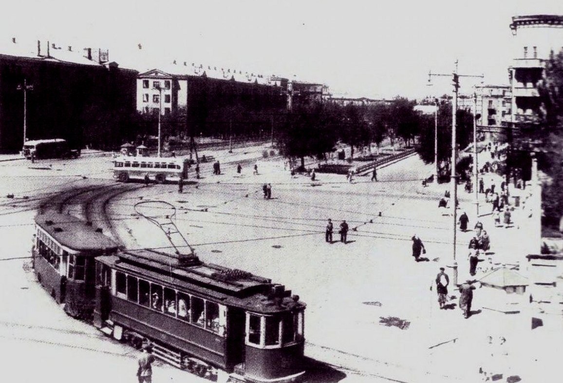 Перед нами фотографія приблизно 70-річної давнини. Не одразу зрозуміло, наше це місто чи ні. Виявляється, місто наше. Знімок було опубліковано у книзі «Електротранспорт України», автори: С. Тархов, К. Козлов, О. Оландер. Це центральна площа Кам’янського, яка до 1958 р мала назву Транспортна, потім – Леніна, а сьогодні – Майдан Героїв.