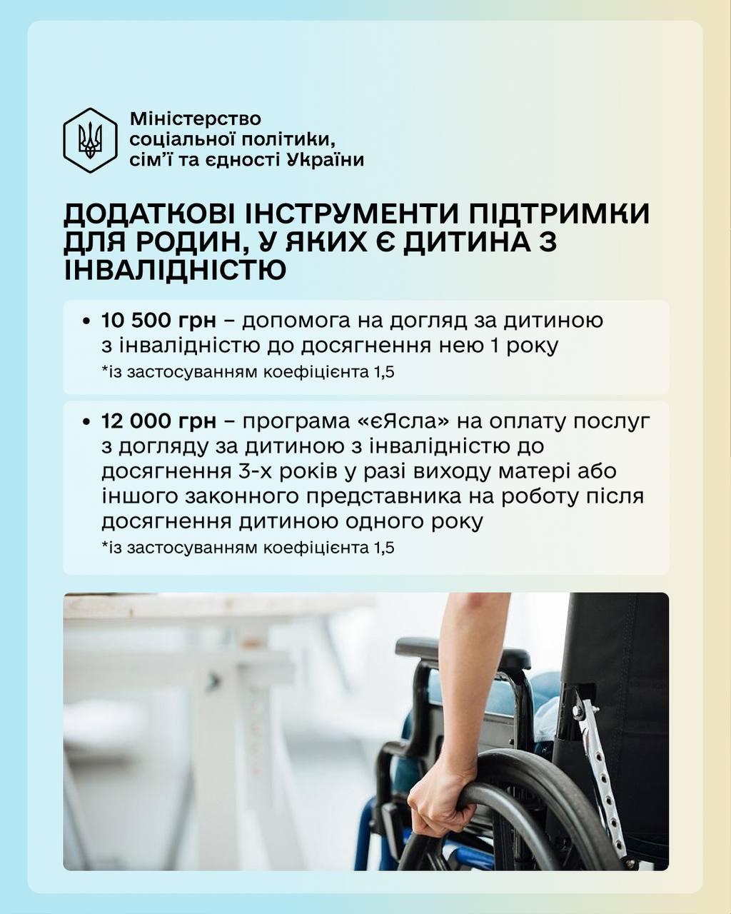 - Щомісячна допомога по догляду за дитиною до одного року складатиме 7 000 грн, а для сімей, які виховують дитину з інвалідністю, — 10 500 грн (коефіцієнт 1,5). З 2027 року розмір допомоги встановлюватиметься держбюджетом на відповідний рік.