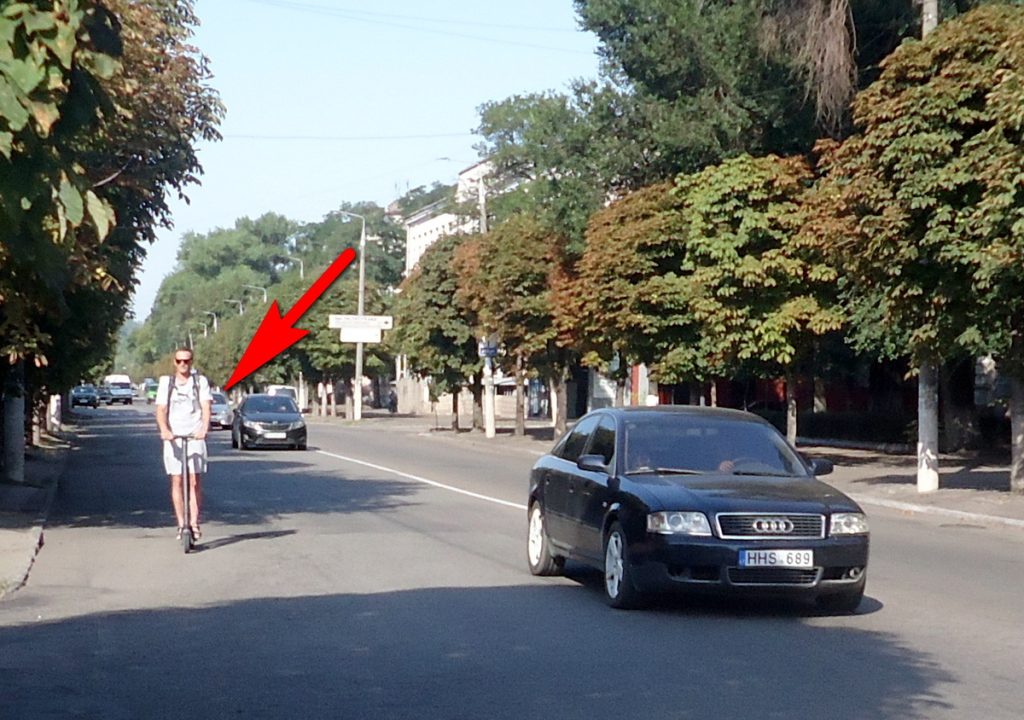 – тримати за ним дистанцію, не меншу, ніж коли ви рухаєтеся за автомобілем, а при обгоні – дотримуватись інтервалу мінімум 1,5 м (це допоможе зреагувати на несподіваний маневр, у тому числі падіння водія електросамоката);